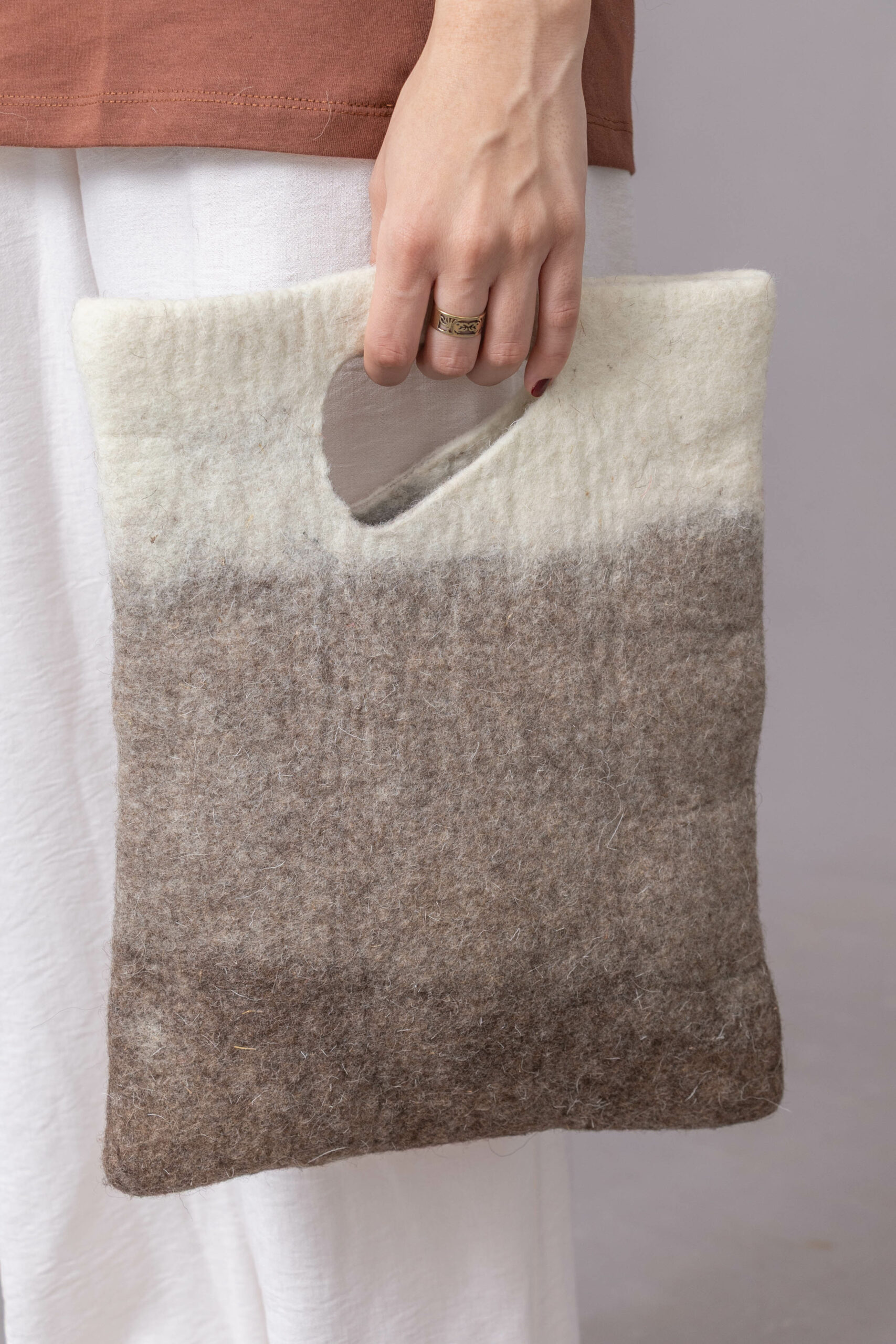 Nous garantissons que l’intégralité de nos pièces en laine feutrée est réalisée artisanalement, valorisant ainsi le travail de la main et l’expression artistique individuelle.
